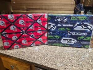 - These boards are customized with fabric and ribbon choice and secured with a decorative brad or button and all come with a hangable ribbon located on the back.